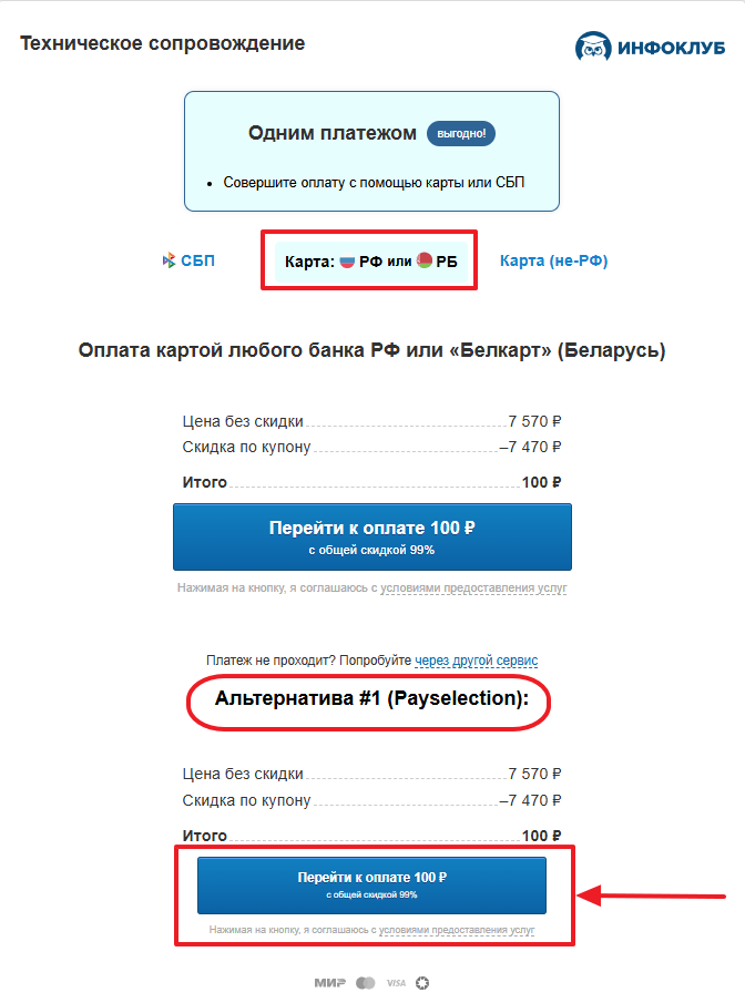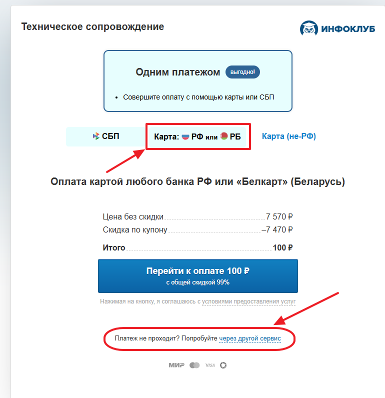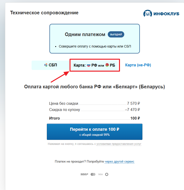 При оплате российской картой или картой «Белкарт» Беларусь убедитесь, что выбрана правильная платежная система «Карта: РФ или РБ»: